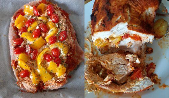 Ξεκινάμε να προετοιμάζουμε τα φιλέτα μας. Παίρνουμε το πρώτο φιλέτο και το μαρινάρουμε με πάπρικα, ρίγανη, αλάτι και πιπέρι και από τις δύο πλευρές. Στην συνέχεια αλείφουμε πάνω του το τυρί κρέμα Φιλαδέλφεια, βάζουμε την κίτρινη πιπεριά ψιλοκομμένη σε κύβους, τα ντοματίνια ψιλοκομμένα, την ρίγανη, το πιπέρι και το αλάτι.