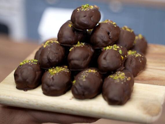 Βουτάμε τα μελομακάρονά στην κουβερτούρα, τα τοποθετούμε σε μια λαμαρίνα με λαδόκολλα και πασπαλίζουμε με τριμμένα φιστίκια Αιγίνης. Αφήνουμε να σφίξει η σοκολάτα και σερβίρουμε.