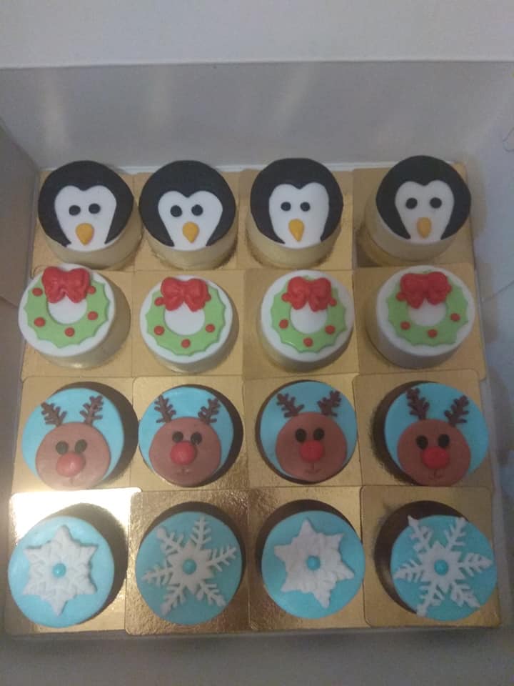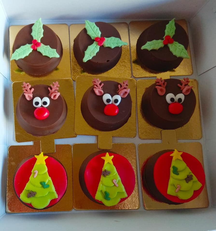 Παίρνουμε φορμάκια σιλικόνης για κεκάκια, βάζουμε μια κουταλιά λιωμένη κουβερτούρα και βάζουμε στο ψυγείο να παγώσει. Βάζουμε ένα μπισκότο με ότι γεύση μας αρέσει σε κάθε φορμάκι και ξαναβάζουμε κουβερτουρα μέχρι να σκεπαστεί το μπισκότο (2-3 κουταλιές της σούπας) και ξαναπαγώνουμε. μόλις παγώσουν καλά ξεφορμάρουμε. Εγώ στόλισα με ζαχαρόπαστα. Η ζαχαρόπαστα είναι μόνο στο πάνω μέρος. Την κολλάω με λιωμένη κουβερτούρα πάνω στο γλυκό. Μεταξύ τους τα κομμάτια ζαχαροπαστας κολλάνε με νεράκι και άχνη . Και έτοιμα!!!