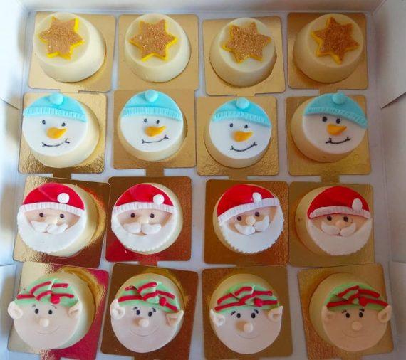 Παίρνουμε φορμάκια σιλικόνης για κεκάκια, βάζουμε μια κουταλιά λιωμένη κουβερτούρα και βάζουμε στο ψυγείο να παγώσει. Βάζουμε ένα μπισκότο με ότι γεύση μας αρέσει σε κάθε φορμάκι και ξαναβάζουμε κουβερτουρα μέχρι να σκεπαστεί το μπισκότο (2-3 κουταλιές της σούπας) και ξαναπαγώνουμε. μόλις παγώσουν καλά ξεφορμάρουμε. Εγώ στόλισα με ζαχαρόπαστα. Η ζαχαρόπαστα είναι μόνο στο πάνω μέρος. Την κολλάω με λιωμένη κουβερτούρα πάνω στο γλυκό. Μεταξύ τους τα κομμάτια ζαχαροπαστας κολλάνε με νεράκι και άχνη . Και έτοιμα!!!