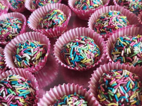 Το κάθε τρουφάκι ζυγίζει περίπου 20 γραμμάρια. Έπειτα βουτάμε το τρουφάκι στην χρωματιστή τρούφα και τα βάζουμε στην κατάψυξη. Λίγο πριν σερβίρουμε τα βγάζουμε από την κατάψυξη και τα αφήνουμε σε θερμοκρασία δωματίου.