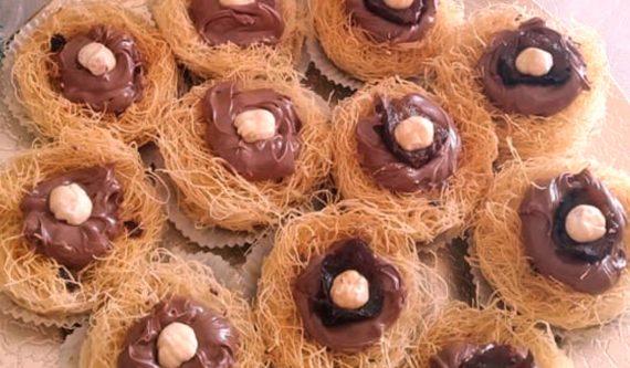 Γιορτινές φωλίτσες από κανταΐφι με μερέντα. Φωλίτσες με σιροπιασμένο κανταΐφι και γεμισμένες με μερέντα και φουντούκια.