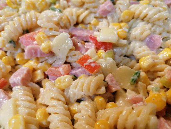 Αρχικά βράζουμε τα μακαρόνια σύμφωνα με τις οδηγίες της συσκευασίας και τα σουρώνουμε. Τα ανακατεύουμε με την πράσινη και την κόκκινη πιπεριά σε κύβους, το ζαμπόν σε κομματάκια, το κασέρι σε κομματάκια, το καλαμπόκι χωρίς τους ζωμούς της κονσέρβας και τον ψιλοκομμένο μαϊντανό.
