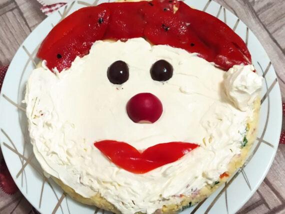 Αναποδογυρίζουμε την σαλάτα σε μία πιατέλα. Χτυπάμε στο μούλτι το τυρί κρέμα και την μαγιονέζα για άλειμμα και αλείφουμε με το μείγμα την πατατοσαλάτα για να πάει παντού. Βάζουμε στην κορυφή την πιπεριά Φλωρίνης από βάζο για το σκούφο, τις ελιές για μάτια, το ραπανάκι για μύτη και την κόκκινη πιπεριά για στόμα.