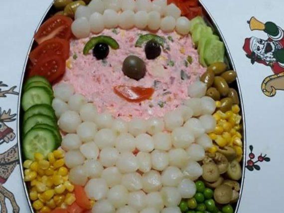Το κύριο μέρος της σαλάτας μας θα είναι μία σπιτική, πεντανόστιμη πατατοσαλάτα με μαγιονέζα, γιαούρτι στραγγιστό, πιπεριά, αρακά, καλαμπόκι, καρότο και παντζάρι και θα φτιάξουμε τον Άγιο Βασίλη με κρεμμύδια για στιφάδο, καλαμπόκι, ελιές, ντομάτες και ό,τι άλλο μας αρέσει.