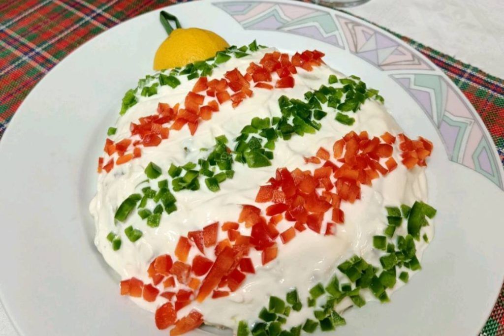 Βάζουμε την πατατοσαλάτα σε ένα πιάτο και δίνουμε σχήμα Χριστουγεννιάτικης μπάλας. Αλείφουμε καλά τη μπάλα με τη μαγιονέζα και διακοσμούμε με τις ψιλοκομμένες χρωματιστές πιπεριές. Κόβουμε το λεμόνι στη μέση και βάζουμε το μισό λεμόνι στο πάνω μέρος της μπάλας. Σας άρεσε αυτή η συνταγή; Πείτε μας την γνώμη σας στα σχόλια.
