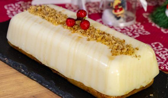 Ingredients 800 g milk 100 g cornstarch 150 g sugar 400 g Christmas honey cookies 2 vanilla 50 g butter —————————— Caramel syrup Walnuts ———————— 25×11 cm