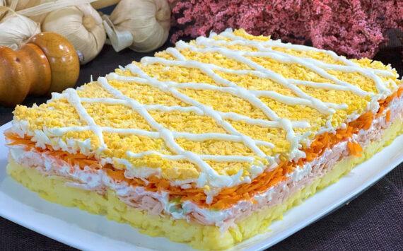 Μία πανέμορφη γιορτινή σαλάτα του Παναγιώτη Παπαδάκη με βραστές πατάτες, σώς από γιαούρτι και μαγιονέζα, καρότα και καπνιστό κοτόπουλο που θα κλέψει τις εντυπώσεις και θα συνοδεύσει υπέροχα τα κρεατικά αλλά και τα ζυμαρικά σας στον γιορτινό μπουφέ. Θα σας τρέξουν τα σάλια και μόνο από τις φωτογραφίες!