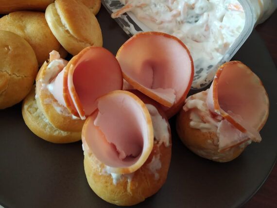 Στη συνέχεια χαμηλώνουμε την φωτιά στους 180 βαθμούς Κελσίου και ψήνουμε μέχρι να ροδίσουν και να γίνουν τραγανά απέξω. Τα αφήνουμε να κρυώσουν και τα κουφώνουμε με ένα κουτάλι. Γεμίζουμε με σαλάτα κηπουρού και φέτα γαλοπούλας και είναι έτοιμα.