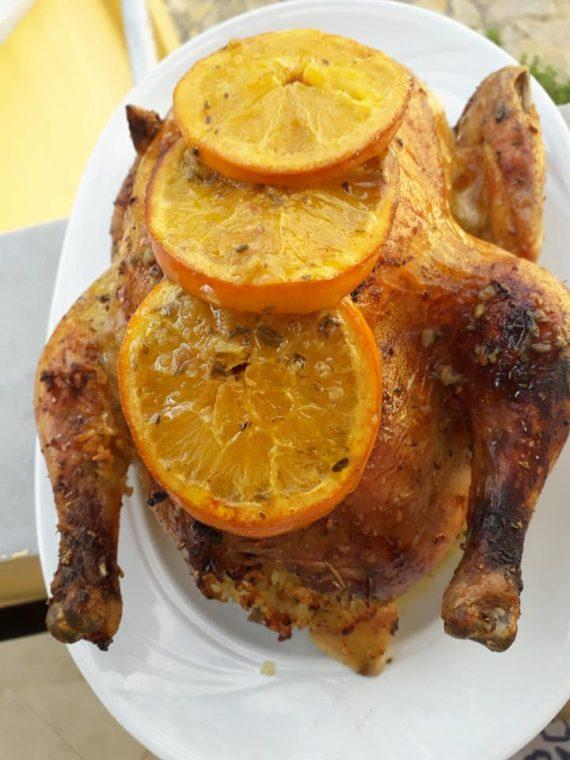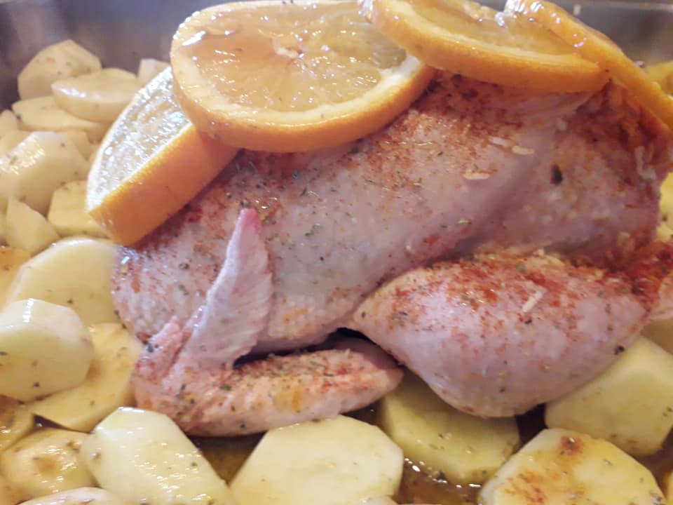 Πατατες,αλάτι, πιπέρι,πάπρικα 3 σκελίδες λιωμένο σκόρδο, κουρκουμα και φέτες πορτοκάλι.