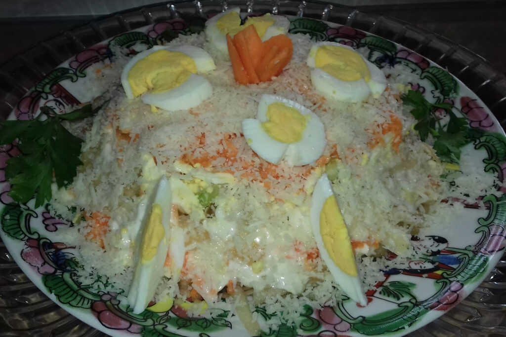 Παίρνουμε ένα πιάτο και βάζουμε στη βάση το μισό από το μείγμα των μήλων. Από πάνω απλώνουμε πολύ λίγη μαγιονέζα. Μετά βάζουμε το μισό μείγμα από τα αυγά και από πάνω λίγη μαγιονέζα. Έπειτα το μισό μείγμα με τα καρότα και πάλι μαγιονέζα. Μετά βάζουμε το μισό τυρί και επαναλαμβάνουμε την διαδικασία μέχρι να τελειώσουν τα υλικά. Στο τέλος βάζουμε όσα τυριά μας έμειναν και στολίζουμε όπως θέλουμε. Σας άρεσε αυτή η συνταγή; Πείτε μας την γνώμη σας στα σχόλια.