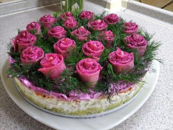 Θα φτιάξουμε πανέμορφα και πεντανόστιμα λουλουδάκια από κρέπες με ζωμό παντζαριού και θα στολίσουμε την σαλάτα μας με μπόλικο άνηθο ή ό,τι άλλο μας αρέσει. Σίγουρα είναι μία σαλάτα – έργο τέχνης που θα αφήσει έκπληκτους όλους τους καλεσμένους και φτιάχνεται πανεύκολα. Φαντασία να έχεις.