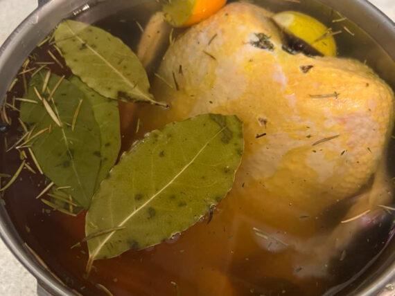 Αποσύρουμε την κατσαρόλα από την φωτιά και αφήνουμε την άλμη να κρυώσει τελείως. Στην συνέχεια βάζουμε την γαλοπούλα, το μεγάλο κοτόπουλο ή τον κόκορα σε ένα βαθύ σκεύος και καλύπτουμε με την άλμη.