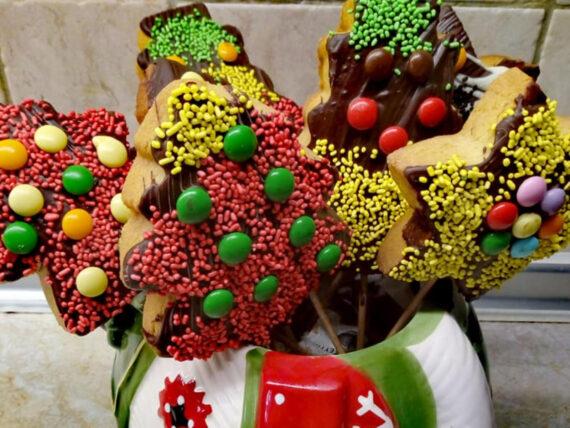 Λιώνουμε τις κουβερτούρες και μόλις κρυώσουν τα μπισκότα τα αλείφουμε με τις σοκολάτες χρησιμοποιώντας ένα πινέλο. Τα πασπαλίζουμε με τρούφα σοκολάτας και καραμελάκια και αφήνουμε τα μπισκότα να στεγνώσουν. Μόλις στεγνώσει η σοκολάτα, καρφώνουμε με προσοχή τα ξυλάκια στα μπισκότα και απολαμβάνουμε.