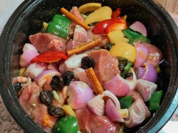 Παίρνουμε τις μπουκιές χοιρινού και τις βάζουμε στη γάστρα. Προσθέτουμε αλάτι και πιπέρι και ανακατεύουμε καλά. Έπειτα προσθέτουμε τις πολύχρωμες πιπεριές χοντροκομμένες και χωρίς τα σπόρια τους, τα δαμάσκηνα ολόκληρα, τα κρεμμύδια κομμένα στα τέσσερα, τον χυμό πορτοκαλιού και το ξύσμα.