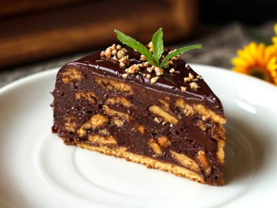 1 liter almond milk (unsweetened) 150 g sugar 100 g cornstarch 40 g cocoa powder 2 vanilla 70 g vegetable oil 300 g digestive biscuits 4 digestive biscuits 170 g almond milk (unsweetened) 300 g dark chocolate Biscuits or Walnuts (chopped) 20×11 cm