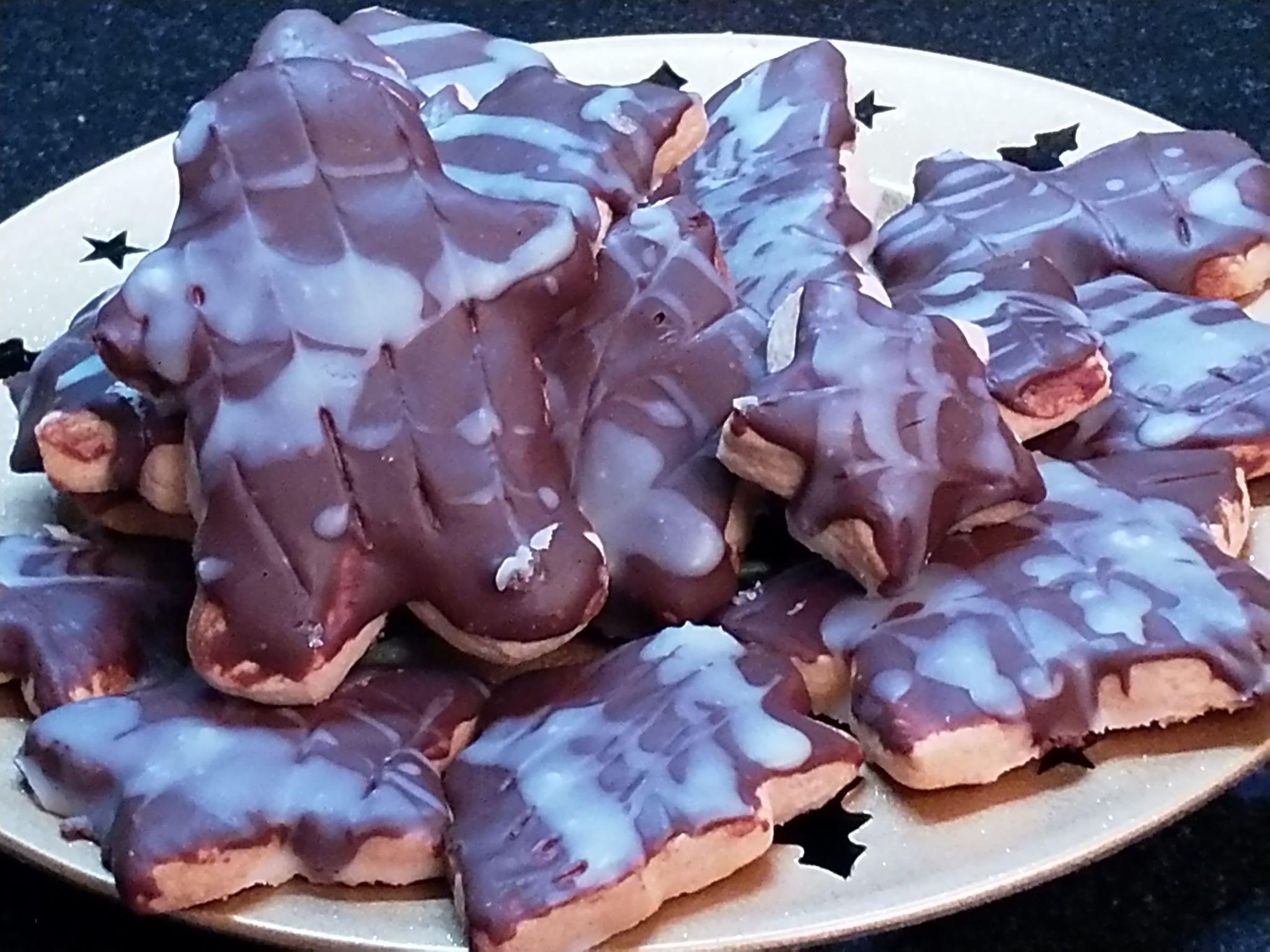 Σ ενα μεγαλο μπολ κτυπαω με το μιξερ το βουτυρο να αφρατεψει! Μετα τα αυγα ,την αχνη ,το νισεστε ,τις βανιλιες και συνεχιζω μεχρι που να γινει ενα ομοιομορφο μειγμα! Στο τελος ριχνω το αλευρι σιγα σιγα και ζυμωνω με τα χερια μεχρι η ζυμη μου να μην κολλαει στα χερια και στα τοιχωματα του μπολ! Βαζω μια λαδοκολλα στον παγκο μου και τοποθετω αεκετη ζυμη! Την απλωνω με τα χερια μου ,τη σκεπαζω με αλλη λαδοκολλα και με εναν πλαστη ανοιγω φυλλο περιπου ενα εκατοστο παχος! Κοβω με τα κουπατ ! Τα μεγαλα αστερια μαζι τα μιρα σε αλλο ταψι! Με το κουπατ νουμερο 3 κοβω περισσοτερα αστερακια για να κανω πιο μεγαλο το δενδρο μου! Τα ψηνω σε προθερμασμενο φουρνο για 20 με 30 λ αναλογα αν τα θελετε πιο τραγανα! Αφου ψηουν τα αφηνω να κρυωσουν πολυ καλα για να μη σπασουν! Αφου κρυωσουν ζεσταινω τη σοκολατα σε μπαιν μαρι σε σιγανη φωτια! Βαζω 2 κουταλιες γαλα και μια λαδι η μελι για να γυαλισει η σοκολατα μας! Αλειφω τη σοκολατα με ενα πινελο το καθε μπισκο και αρχιζω να στηνω το δενδρο μου! Στη συνεχεια λιωνω σε μπαιν μαρι την ασπρη κουβερτουρα και τη ριχνω επανω στο δενδρακι μου για να τη στολισω! Για φωτακια εβαλα βρωσιμα λουλουδακια! Τ μπισκοτα που περισσεψαν τα στολισα και αυτα με σοκολατα! Σας ευχομαι καλη επιτυχια και