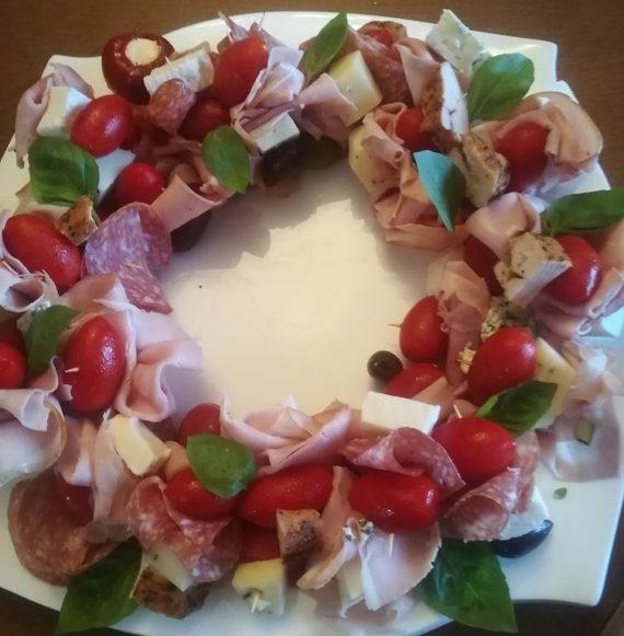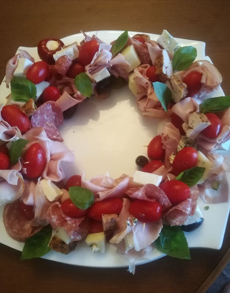 Πέρασα σε οδοντογλυφίδες διάφορα είδη τυριών (φέτα, γραβιέρα, blue cheese) κομμένα σε κυβάκια, αλλαντικά (σαλάμι αέρος, ζαμπόν, γαλοπούλα, μορταδέλα), πιπερίτσες, ντοματίνια για κόκκινο χρώμα, ελιές (πράσινες, μαύρες) και τις έβαλα γύρω γύρω από την πιατέλα μου, κάνοντας δύο σειρές η μία πάνω στην άλλη. Στο τέλος έβαλα λίγα φυλλαράκια βασιλικού! Χρειάστηκαν περίπου 30-35 οδοντογλυφίδες.