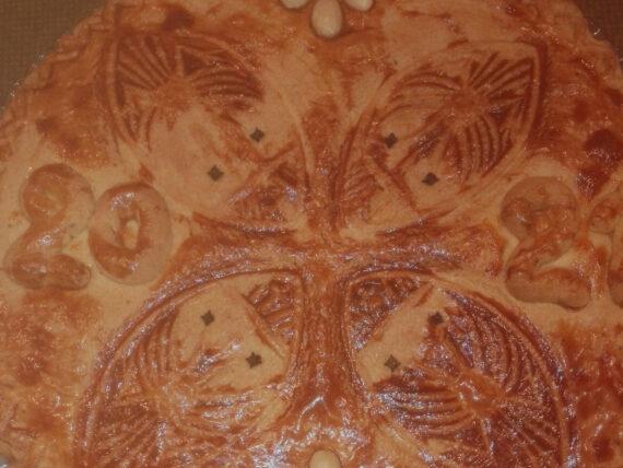 Μεταφέρουμε εκεί την μισή ζύμη και την στρώνουμε. Αν έχουμε σφραγίδα την χρησιμοποιούμε για να δώσουμε το σχήμα. Αλείφουμε με τα χτυπημένα αυγά και το γάλα και διακοσμούμε με καρφάκια γαρίφαλο και τα αμύγδαλα χωρίς την φλούδα τους.