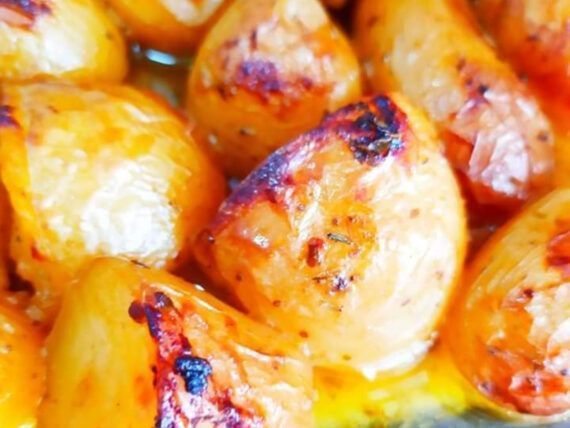 Συνταγή για πατάτες baby για το γιορτινό τραπέζι. Καραμελωμένες πατάτες baby φούρνου με ζάχαρη, κρασί, χυμό λεμονιού και μυρωδικά για τον Πρωτοχρονιάτικο μπουφέ. Μία ξεχωριστή συνταγή για το Πρωτοχρονιάτικο τραπέζι για να συνοδεύσει την γεμιστή γαλοπούλα, το γεμιστό κοτόπουλο ή τα κρέατα στα κάρβουνα. Θα σας δείξουμε να τις μαγειρεύετε και με φλούδα και χωρίς.