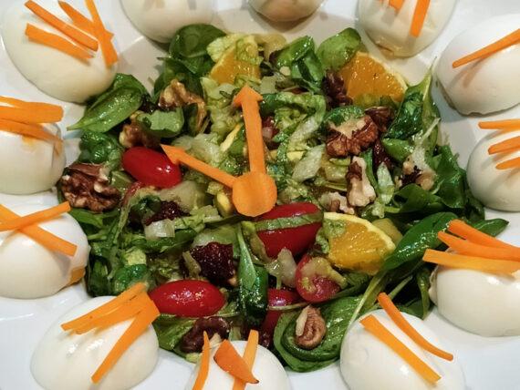Αρχικά ψιλοκόβουμε το μαρούλι, κόβουμε στην μέση τα ντοματίνια, σπάμε τα καρύδια, και κόβουμε σε λωρίδες τα καρότα. Δύο κομμάτια καρότο τα κάνουμε να δείχνουν με δείκτες για το ρολόι μας. Βράζουμε καλά τα αυγά και τα κόβουμε στην μέση.