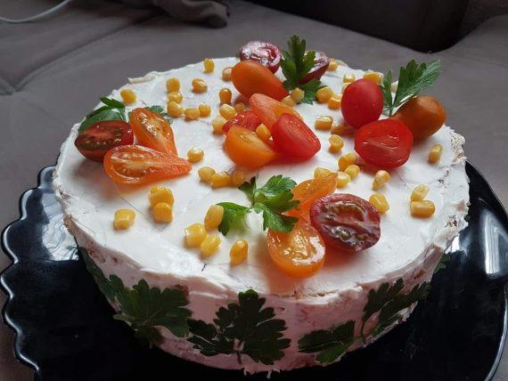 Μετά την μία ώρα ξεφορμάρουμε την σαλάτα μας και την αλείφουμε όλη την σαλάτα με τυρί κρέμα τύπου Φιλαδέλφεια. Στολίζουμε την σαλάτα μας με ψιλοκομμένο μαϊντανό και ντοματίνια. Μπορούμε να βάλουμε οτιδήποτε άλλο θέλουμε στον στολισμό.