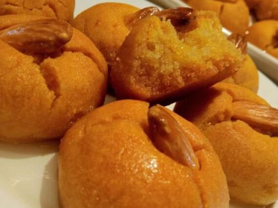 Χωρίζουμε την ζύμη σε μπαλάκια, τα οποία τα δουλεύουμε για 1 λεπτό και τα τοποθετούμε σε ένα ταψί με λαδόκολλα. Βάζουμε σε κάθε μπαλάκι από 1 αμύγδαλο και ψήνουμε στους 180 βαθμούς Κελσίου, σε προθερμασμένο φούρνο, στις αντιστάσεις, στη μεσαία σχάρα για 30 λεπτά, ανάλογα και τον φούρνο.