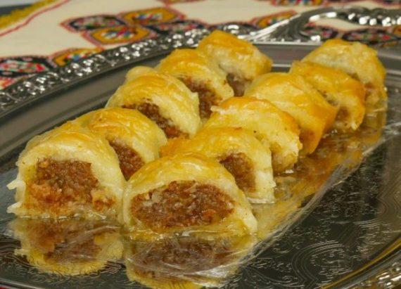 Βάζουμε την ζάχαρη να βράσει μαζί με το νερό για 5 λεπτά. Αρωματίζουμε με τις βανίλιες και τον χυμό από το λεμόνι. Στους αλεσμένους ξηρούς καρπούς (καρύδια, αμύγδαλα, συνδυασμό των δύο) βάζουμε την κανέλα, την τριμμένη φρυγανιά, το μέλι και ανακατεύουμε. Προαιρετικά μπορούμε να βάλουμε καβουρδισμένο σουσάμι και λίγο νερό. Παίρνουμε 3 φύλλα μαζί και τα βουτυρώνουμε καλά με λιωμένο βούτυρο. Στην μία άκρη απλώνουμε γέμιση και τυλίγουμε σε ρολό. Πατάμε τις δύο άκρες να συμπιεστούν. Τοποθετούμε τα ρολά σε βουτυρωμένο ταψί ή πυρίμαχο σκεύος (40×27 εκατοστά) Τα κόβουμε σε μπουκίτσες και βουτυρώνουμε. Ψήνουμε στους 180 βαθμούς μέχρι να ροδίσουν. Όσο το γλυκό είναι καυτό σιροπιάζουμε με κρύο σιρόπι. Για καλύτερο αποτέλεσμα σερβίρουμε μετά από 12 ώρες.