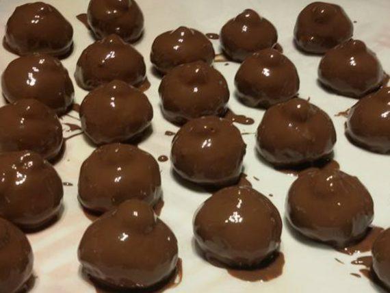 Βουτάμε λοιπόν τα μπαλάκια μας στην ζεστή κουβερτούρα και τα τοποθετούμε πάνω σε μία λαδόκολλα. Αφήνουμε τα σοκολατάκια μας στην λαδόκολλα για τουλάχιστον 1 ώρα, έτσι ώστε να παγώσει τελείως η λιωμένη κουβερτο0ύρα. Τα βάζουμε σε χαρτάκια για κεράσματα και απολαμβάνουμε.