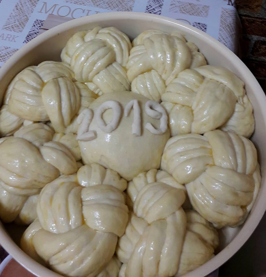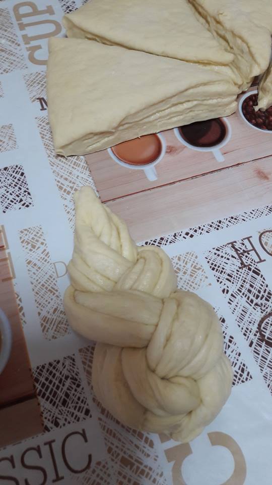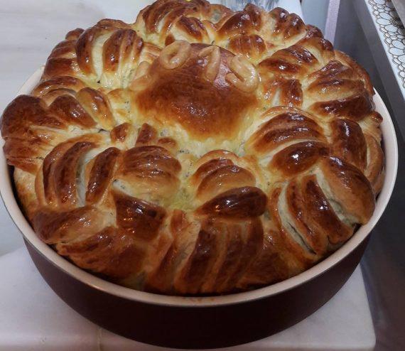 Βάζω σε μια λεκάνη το αλάτι,τη ζάχαρη,το λάδι,το γιαούρτι,το γάλα,τα 2 αυγά και το ασπράδι.Τη μαγιά την ανακατεύω με το αλεύρι.Προσθέτω σιγά σιγά το αλεύρι και ζυμώνω πολύ καλά.Η ζύμη πρέπει να είναι εύπλαστη,όχι σκληρή.Την αφήνω να ξεκουραστεί και να φουσκώσει.Αφού φουσκώσει η ζύμη,τη ξανά ζυμώνω για λίγο,για να ξεφουσκώσει.Την χωρίζω σε 4 ίσια μπαλάκια,αφού έχω αφήσει ένα κομμάτι ζύμης για το κέντρο.Ανοίγω κάθε μπαλάκι σε στρογγυλό σχήμα και αλείφω με βούτυρο.Το τελευταίο δεν το αλείφω. Βάζω το ένα πάνω στο άλλο.Τη συνέχεια θα τη δείτε στις φωτογραφίες.Ψήνω στους 180° για 1 ώρα περίπου,ανάλογα με το φούρνο.