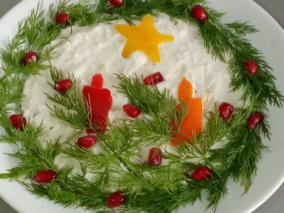 Πλένουμε τα κλαράκια του άνηθου και τα τοποθετούμε γύρω γύρω από την τυροσαλάτα σαν στεφάνι. Έπειτα με Χριστουγεννιάτικα κουπάτ ή με ένα μαχαίρι δίνουμε σχέδια στην κόκκινη, την πορτοκαλί και στην κίτρινη πιπεριά. Αστεράκια, κεράκια, ό,τι μας είναι πιο εύκολο και μας αρέσει. Στο τέλος διακοσμούμε μ ρόδι και απολαμβάνουμε.