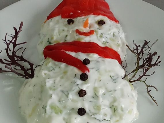 Συνταγή για τζατζίκι σε γιορτινό σχέδιο χιονάνθρωπου για το τραπέζι και τον μπουφέ της Πρωτοχρονιάς. Σπιτικό, πικάντικο και μαμαδίστικο τζατζίκι με απλά υλικά που θα συνοδεύσει τέλεια το κρέας, τις τηγανιτές πατάτες και το ψωμί.