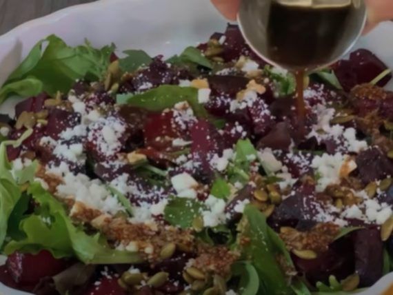 Θα ψήσουμε παντζάρια και θα τα ανακατέψουμε με μαρούλι, κολοκυθόσπορους, φέτα και μία σώς από μπαλσάμικο, χυμό λεμονιού, μουστάρδα και μέλι. Είναι μία υγιεινή σαλάτα γεμάτη Χριστουγεννιάτικα χρώματα και γεύσεις που θα ικανοποιήσει και τον πιο απαιτητικό καλεσμένο σας.
