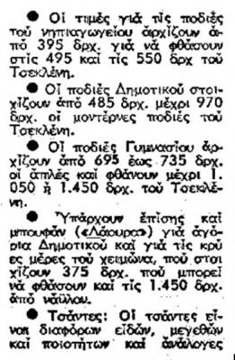 Πάντως όσο υπήρχαν, στην αρχή κάθε σχολικής χρονιάς, όλοι οι μαθητές του δημοτικού, αγόρια και κορίτσια και τα κορίτσια του Γυμνασίου/Λυκείου, συνέρρεαν συνοδεία γονέων ή κηδεμόνων σε βιοτεχνίες αλλά και μεγάλα καταστήματα, όπως ήταν το ΜΙΝΙΟΝ ή ΑΦΟΙ ΛΑΜΠΡΟΠΟΥΛΟΙ, προκειμένου να αγοράσουν σχολική ποδιά. Το 1975 οι ποδιές έφτασαν τις 3.500 και 4.000 δραχμές όταν ήταν ακριβής μάρκας, ενώ τα τελευταία χρόνια πριν την κατάργηση, οι περίφημες σχολικές ποδιές «Tseklenis» κόστιζαν τα διπλά χρήματα και ομολογουμένως ήταν άριστης ποιότητας κι αισθητικής.