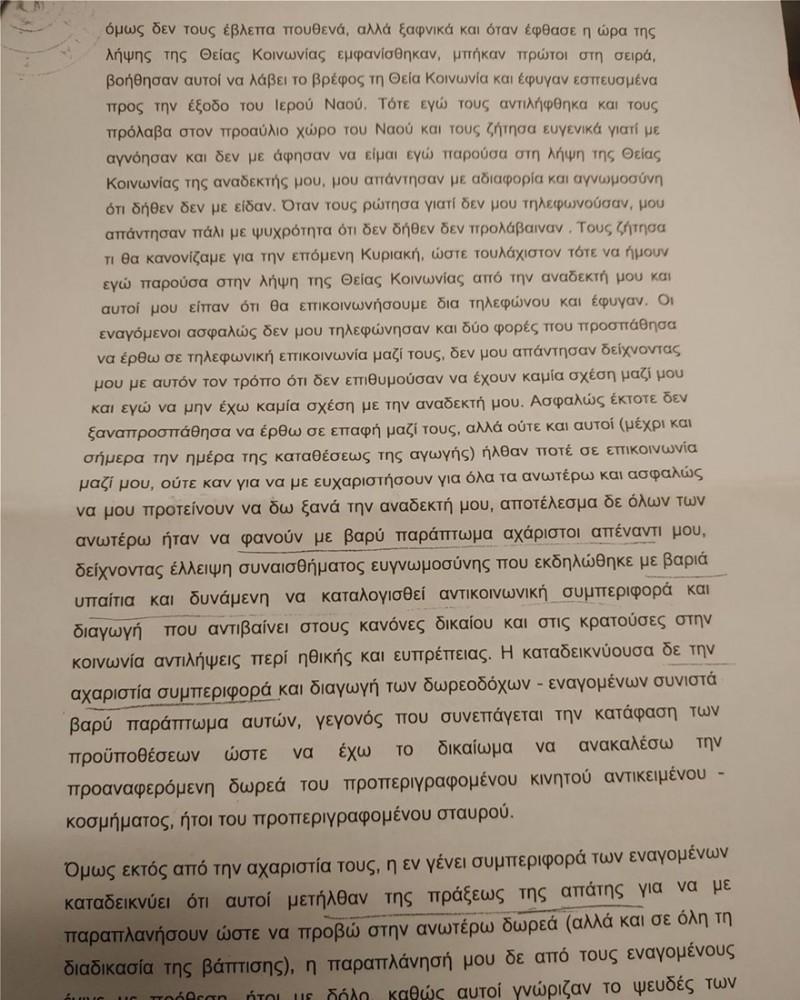 Όπως ισχυρίζεται στην αγωγή της, όταν πήγε στην εκκλησία ήταν εκεί οι γονείς μαζί με το μωρό και έκαναν πως δεν την είδαν.Όταν τους ρώτησε γιατί έγινε αυτό, της απάντησαν πως δεν την είχαν δει μέσα στην εκκλησία.Έτσι αποφάσισε να καταθέσει αγωγή και να ζητήσει πίσω τον σταυρό!