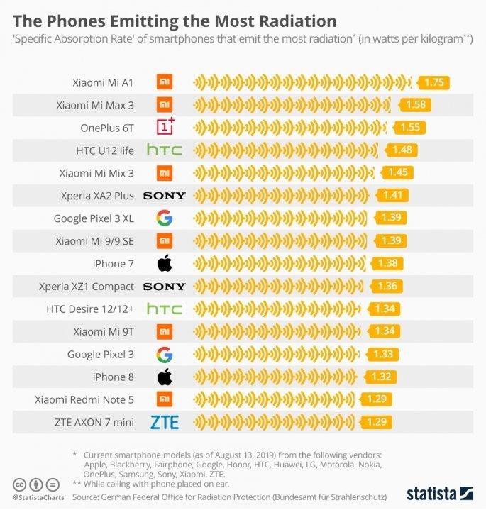 Με βάση τα στοιχεία του γερμανικού οργανισμού ο ιστοτόπος Statista δημιούργησε μια λίστα στα τέλη Αυγούστου του 2019, με τις συσκευές που εκπέμπουν τα μεγαλύτερα ποσά ακτινοβολίας (Watt ανά κιλό βάρους).