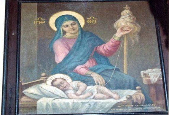 Μια άλλη σπάνια εικόνα της Παναγίας Μητέρας του Κυρίου να Τον κανακεύει σαν μωρό και να γνέθει για να Του πλέξει ρουχαλάκια.