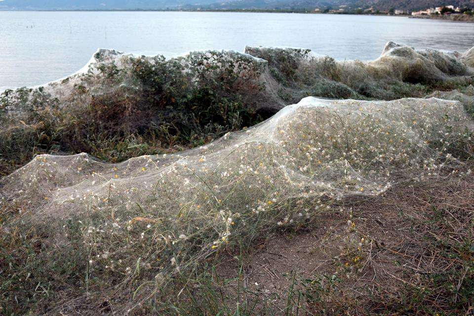 Ένα περίεργο και πρωτόγνωρο θέαμα αντίκρισαν ντόπιοι και τουρίστες στο Αιτωλικό. Συγκεκριμένα στην ανατολική παραλία της λιμνοθάλασσας, πριν την γέφυρα, υπάρχει ένα τεράστιο πέπλο από ιστούς που έφτιαξαν αράχνες που έχει καλύψει τα φυτά (φοίνικες, αρμυρίκια και ποώδη βλάστηση) σε μήκος τουλάχιστον 300 μέτρων. Η είδηση αυτή και φυσικά οι εικόνες από την περιοχή έκαναν τον γύρου του διαδικτύου. Το newsit.gr επικοινώνησε με μια ειδικό προκειμένου να εξηγήσει το συγκεκριμένο φαινόμενο και όπως αποκαλύπτει όλο αυτό δεν είναι παρά ένα μεγάλο φαγοπότι αφού το συγκεκριμένο είδος αράχνης είναι «μάστορας» στους ιστούς και όταν βρει τις κατάλληλες συνθήκες του δίνει και καταλαβαίνει!