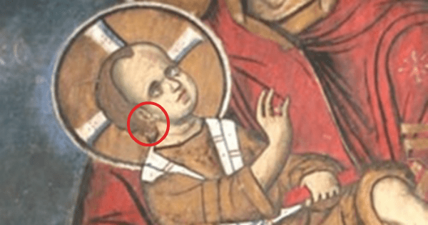 Αν προσέξουμε καλά τον Ιησού θα δούμε ότι στο αφτί Του φοράει ένα σκουλαρίκι. Το ίδιο κόσμημα βλέπουμε και στην τοιχογραφία που βρίσκεται ακριβώς απέναντι από την Παναγία, όπου ο Ιησούς αγκαλιάζεται «χερσί πρεσβυτικαίς» από τον Συμεών.