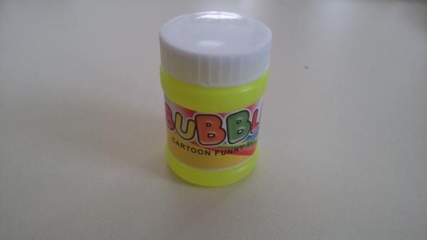 Υγρό για σαπουνόφουσκες. Υγρό αναπλήρωσης σε παιχνίδια για σαπουνόφουσκες, σε κίτρινο δοχείο µε πολύχρωµη ετικέτα και λευκό πώµα.
