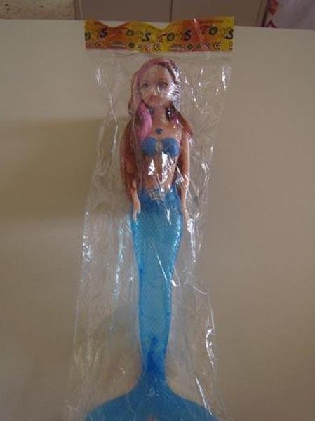Πλαστική κούκλα γοργόνα µε ροζ/καφέ, µακριά µαλλιά, µπλε σουτιέν και µπλε ουρά. Συσκευάζεται σε διάφανη, πλαστική σακούλα.