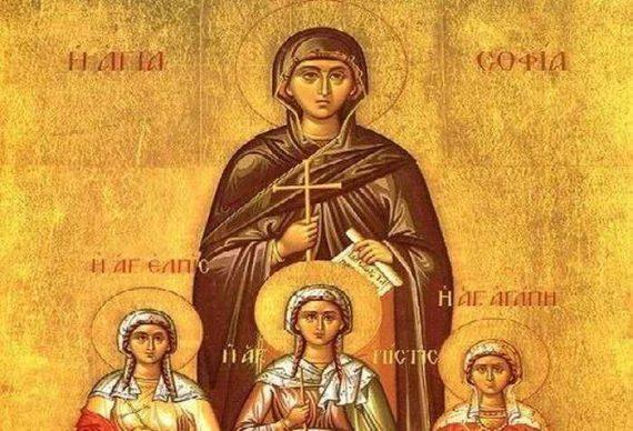 ΑΓΙΑ ΣΟΦΙΑ: Στα χρόνια πού βασίλευε στην κοσμοκράτειρα Ρώμη ο Αδριανός, σε μια πόλη της Ιταλίας, ζούσε η ευσεβής και πιστή στον Θεό Σοφία. Καταγόταν από σπουδαία οικογένεια, αλλά σχετικά νωρίς έμεινε χήρα με τρεις θυγατέρες. Για λόγους πού δεν είναι γνωστοί, αργότερα η Σοφία πήρε τις τρεις κόρες της και πήγε στη Ρώμη, όπου συνέχισαν την ενάρετη ζωή τους. Δεν επέλεξε συμπτωματικά και τα ονόματα των τριών θυγατέρων της, αφού τους έδωσε τα ονόματα πού συνοψίζουν τις τρεις βασικές αρετές του χριστιανού, τις οποίες επισημαίνει ο απόστολος Παύλος στον «ύμνο της αγάπης» (Α 7 Κορ. 13,13): νυνί δε μένει πίστις, ελπίς, αγάπη. Και τόσο με το παράδειγμά της όσο και με την ανατροφή πού τους έδωσε, οι τρεις θυγατέρες της επιβεβαίωναν στην πράξη ότι όντως βίωναν και την πίστη και την ελπίδα και την αγάπη. Ήταν αντάξια προς τη ρίζα και τον κορμό κλαδιά!