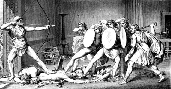 Της Θεάς που μελετά τον εχθρό και τον πολεμά με τα ίδια του τα όπλα. Όταν όμως έρχεται η ώρα, όταν τους έχει στριμώξει όλους άοπλους σε ένα δωμάτιο, όταν φανερώνεται πάνοπλος, ΤΟΤΕ ΕΚΦΡΑΖΕΙ ΤΗΝ ΟΡΓΗ ΤΟΥ. ΚΑΙ ΔΕΝ ΔΕΙΧΝΕΙ ΟΙΚΤΟ, ΓΙΑΤΙ Ο ΚΟΣΜΟΣ ΤΟΥ ΕΙΝΑΙ ΤΟ ΒΙΟΣ ΤΟΥ, που δημιούργησε με τον δικό του ιδρώτα, ΕΙΝΑΙ Η ΠΑΤΡΙΔΑ ΤΟΥ που οι μνηστήρες καταχράστηκαν και καπηλεύτηκαν μαζί με την φιλοξενία του οίκου του που τιμησε τον ΞΕΝΙΟ ΔΙΑ.
