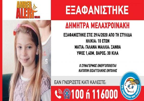 Στις 29/4/2020, στις 9.30 ώρα, εξαφανίστηκε από τη Στυλίδα Φθιώτιδας η Μελαχροινάκη Δήμητρα, 10 ετών.