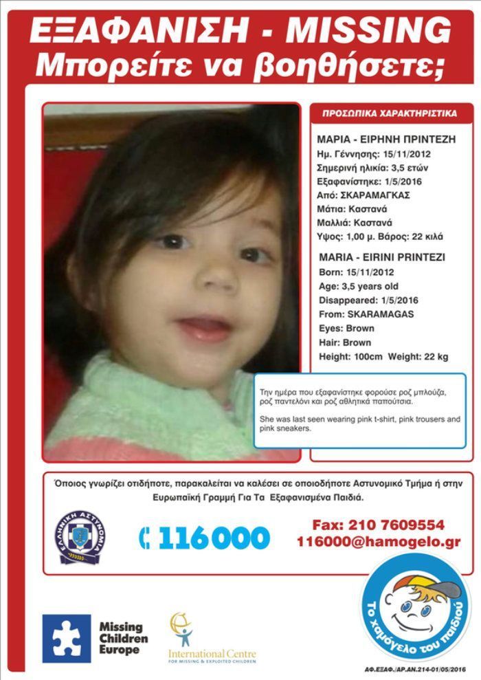 Στις 01/05/16 στις 14.40, εξαφανίστηκε από την περιοχή του Σκαραμαγκά, η Μαρία- Ειρήνη Πρίντεζη, 3,5 ετών.
