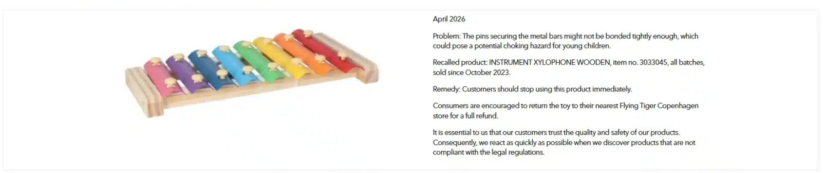Νέα ανάκληση προϊόντος από την Flying Tiger Copenhagen έρχεται να προστεθεί σε μια σειρά αντίστοιχων περιστατικών που έχουν καταγραφεί τους τελευταίους μήνες από την ίδια αλυσίδα, η οποία δραστηριοποιείται διεθνώς και διαθέτει τα προϊόντα της σε πολλές ευρωπαϊκές χώρες, μεταξύ αυτών και η Ελλάδα. Πρόκειται για το ξυλόφωνο με μεταλλικές μπάρες, με την εμπορική ονομασία “Instrument Xylophone Wooden” , το οποίο έχει διατεθεί στην αγορά από τον Οκτώβριο του 2023 σε όλες τις παρτίδες.