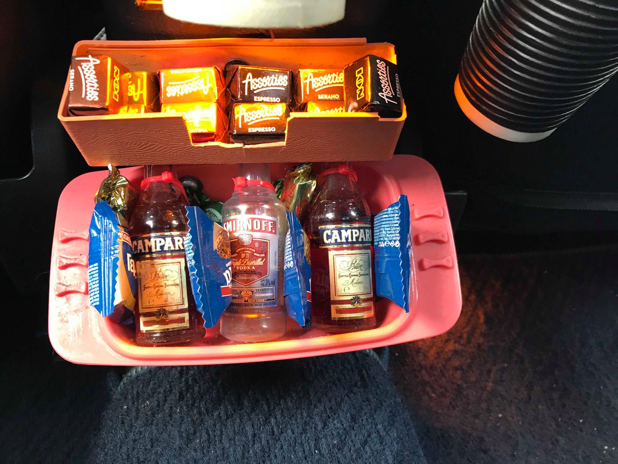 Παντού μπουκαλάκια με νερό ή χυμό, μπολ με καραμέλες, μπισκότα και σοκολάτες, περιοδικά ποικίλης ύλης, μέχρι και μίνι μπουκαλάκια Campari και Gordon’s για τους πιο τολμηρούς. Όλα αποκλειστικά για τον πελάτη. «Δεν θέλω να κατέβω!» του είπα.