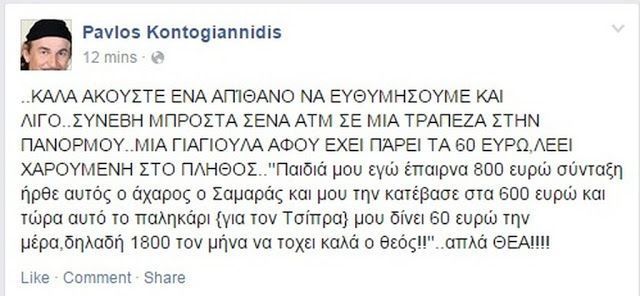 ”Παιδιά μου εγώ έπαιρνα 800 ευρώ σύνταξη ήρθε αυτός ο άχαρος ο Σαμαράς και μου την κατέβασε στα 600 ευρώ και τώρα αυτό το παληκάρι {για τον Τσίπρα} μου δίνει 60 ευρώ την μέρα,δηλαδή 1800 τον μήνα να τοχει καλά ο θεός!!”..απλά ΘΕΑ!!!!» έγραψε χαρακτηριστικά
