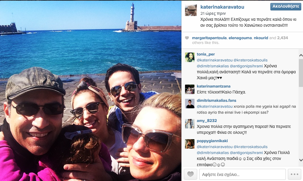 Φωτογραφίες από το Πάσχα τους στην Κρήτη «ανέβασε» και η Κατερίνα Καραβάτου η οποία, όπως σας έχουμε ενημερώσει, βρίσκεται εκεί με το σύζυγό της Κρατερό Κατσούλη και τους Δημήτρη Μακαλιά και Αντιγόνη Ψυχράμη.