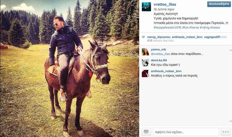 Καβάλα σε ένα γάιδαρο ευχήθηκε «Χριστός Ανέστη» στους διαδικτυακούς του φίλους ο Ηλίας Βρεττός ο οποίος βρίσκεται στο Περτούλι στα Τρίκαλα όπου περνά στιγμές χαλάρωσης.